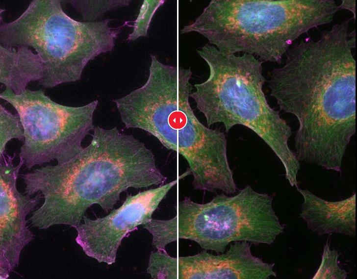 这张图像包含DAPI-Nuclei(蓝色)、Alexa488-Actin(绿色)、MitoRed-mitochondria(红色)和 Alexa647-WGA(紫红色),显示了K5摄像头的科学级CMOS技术与CCD摄像头相比所带来的改善。