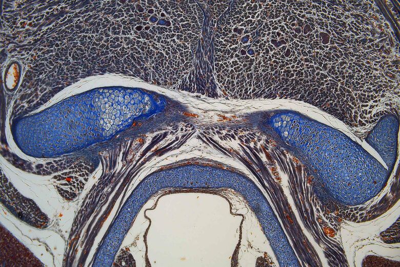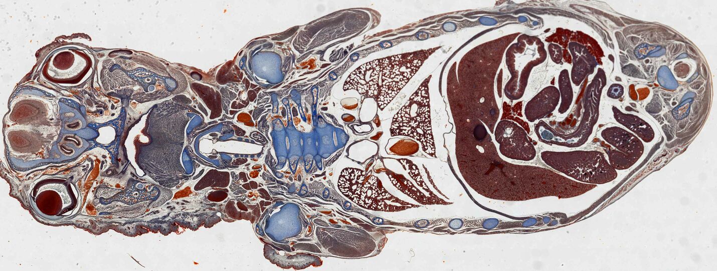 整个小鼠胚胎的大图拼接,由HE染色的连续切片的380张单独图像拼接而成。 用20倍物镜对切片进行成像,使用LAS X Navigator软件在80秒内采集所有图像